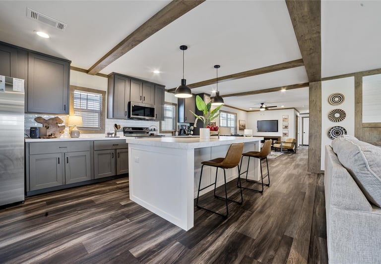 This home offers the perfect blend of modern design and country charm. Featuring 4 bedrooms and 2 bathrooms on a spacious 2+ acre lot, this home provides room to live, relax, and entertain. Step inside to an open-concept layout highlighted by recessed lighting and a stylish kitchen complete with a refrigerator, dishwasher, range, and island. The primary suite includes a walk-in closet and en-suite bathroom for added comfort, while the additional bedrooms offer plenty of space for family or guests. Enjoy outdoor living on the large front and back decks. Additional features include a 2-car carport, smart panel skirting, wainscoting, showcasing thoughtful details throughout.